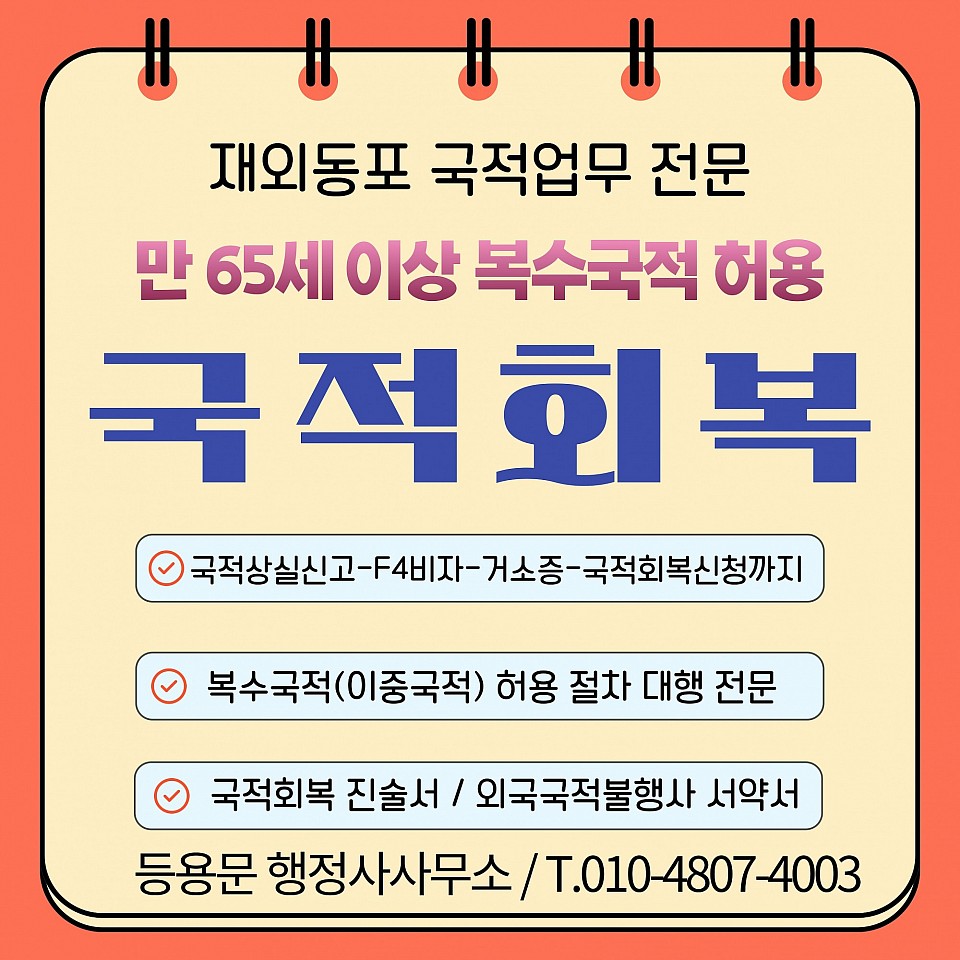 특히 65세 이상 재외동포는 복수국적이 허용되는 중요한 기회이므로, 전문가의 도움을 받아 정확하게 진행하시는 것을 권장드립니다.