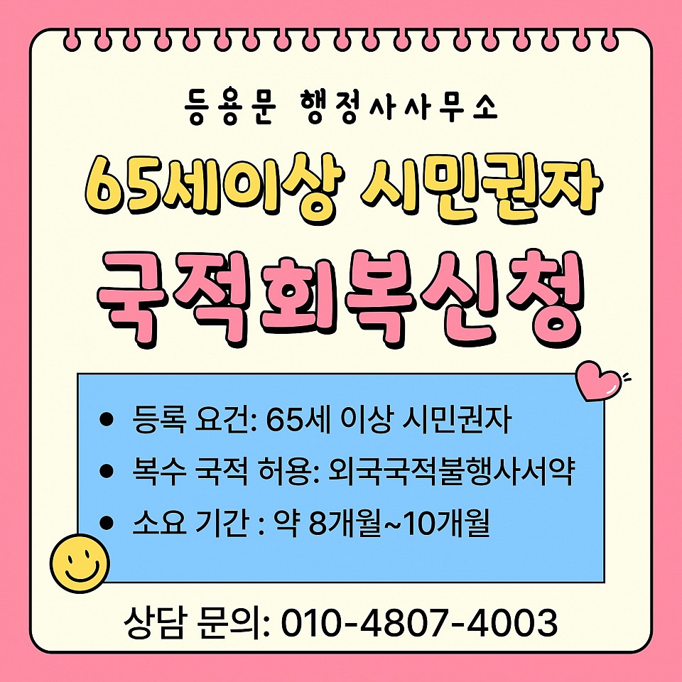 ☞ 즉, 과거 한국인이었던 재외동포라면 만 65세 이상이 되면 대부분 국적회복 절차를 통해 한국 국적을 다시 취득할 수 있습니다.